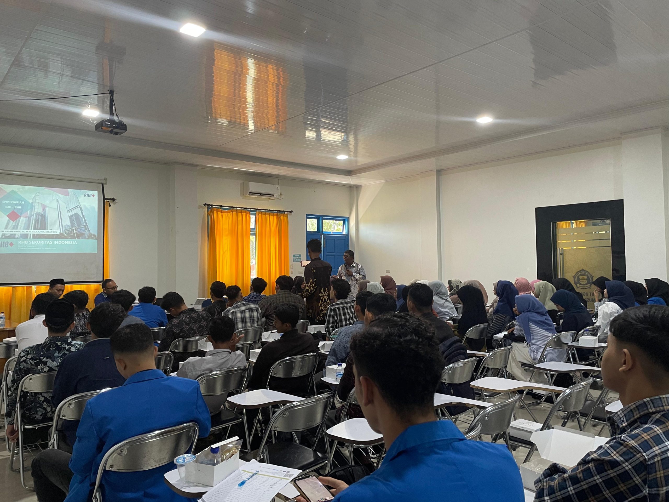 Kegiatan yang mengangkat tema “Peluang dan Tantangan Pasar Modal Syariah di Era Digital” menghadirkan narasumber Muslim Hasan Birga SE MSi, selaku perwakilan dari RHB Kantor Perwakilan Aceh serta Wakil Direktur Galeri Investasi (GI) IAI Almuslim Aceh Dr Junaidi MSh.